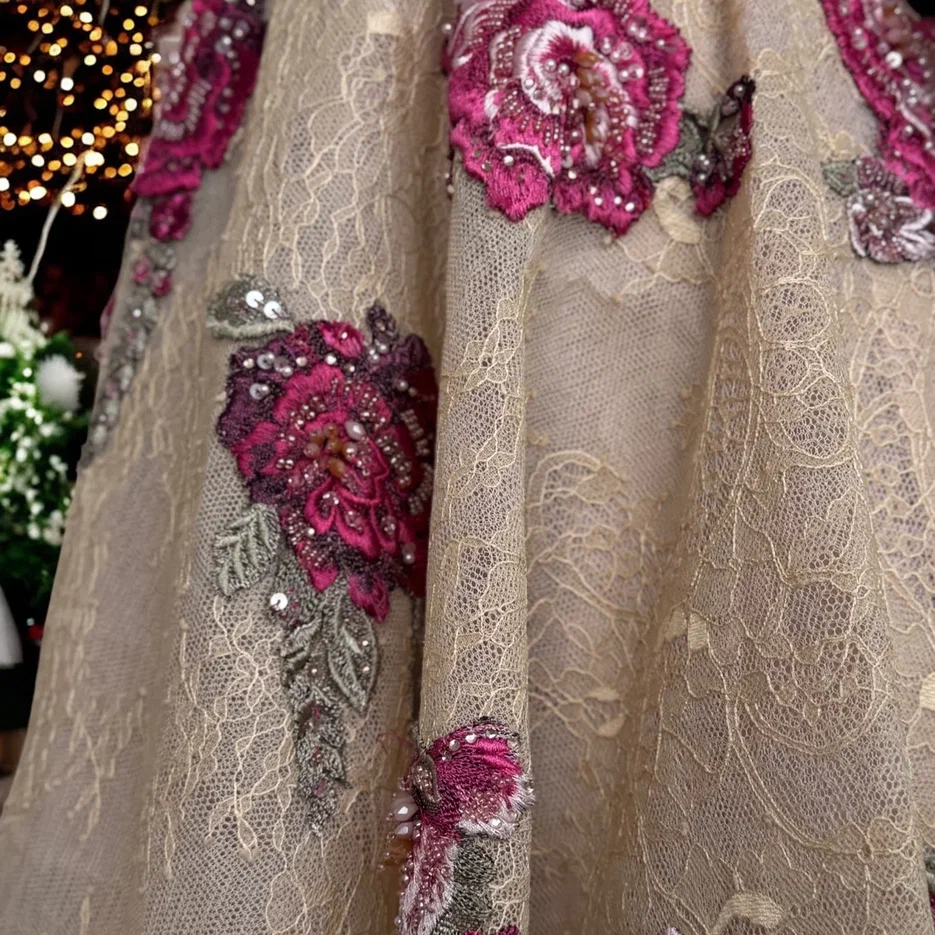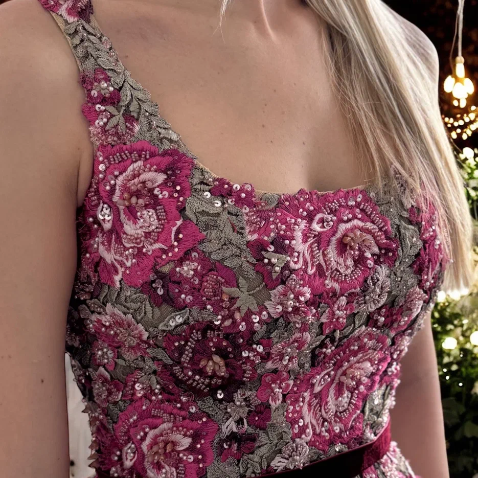 Это платье словно страница из романтического романа: изящное, трогательное и наполненное особым очарованием. Цветочный принт создает нежную атмосферу, а искусно расшитый верх с ручной вышивкой цветов и бусинами придает образу роскошное кружево и уникальность. Идеально подходит для торжественных мероприятий, свадебных банкетов или особых случаев, когда хочется подчеркнуть свою женственность и элегантность.