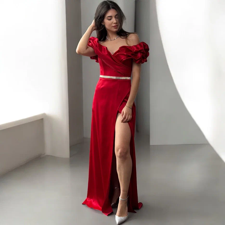 Алое атласное платье Monika с облегающим корсетом и глубоким разрезом — элегантность и страсть для мамы невесты и подружек в Москве!
