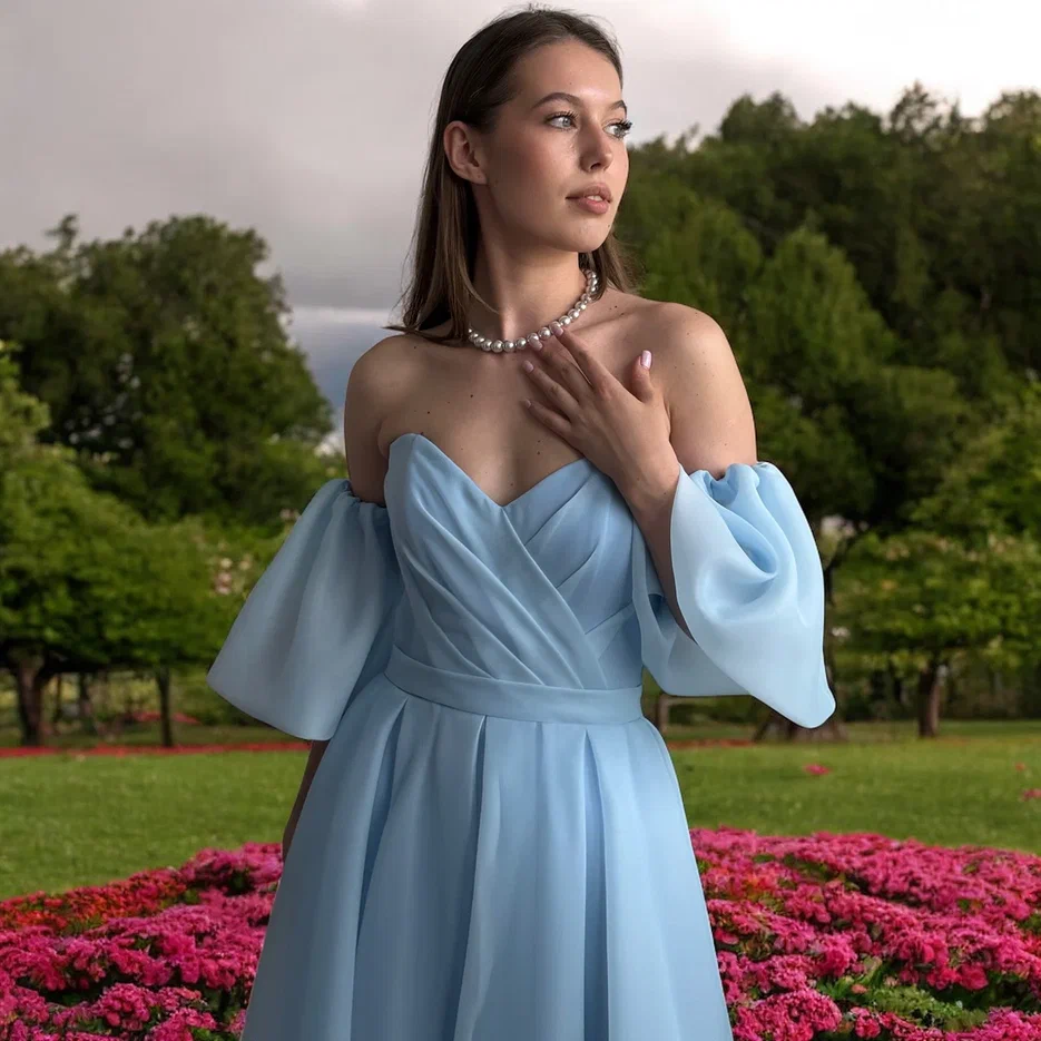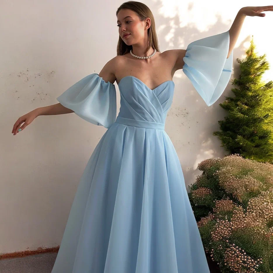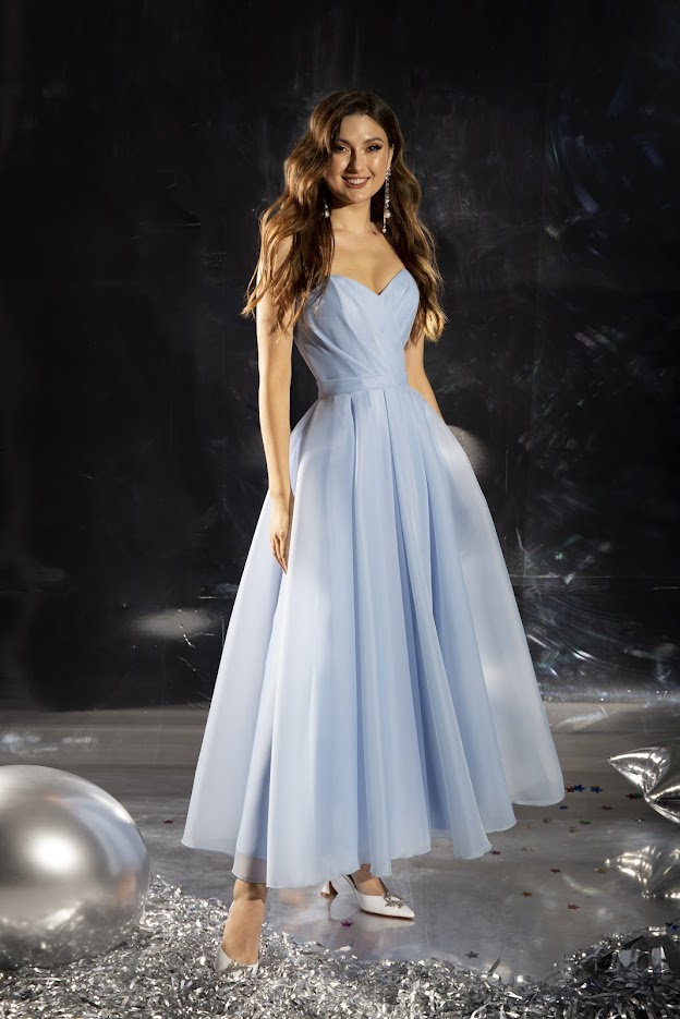 Нежно-голубое воздушное платье с съемными рукавами — элегантность и романтика для мамы невесты, подружек и женщин больших размеров в Москве!