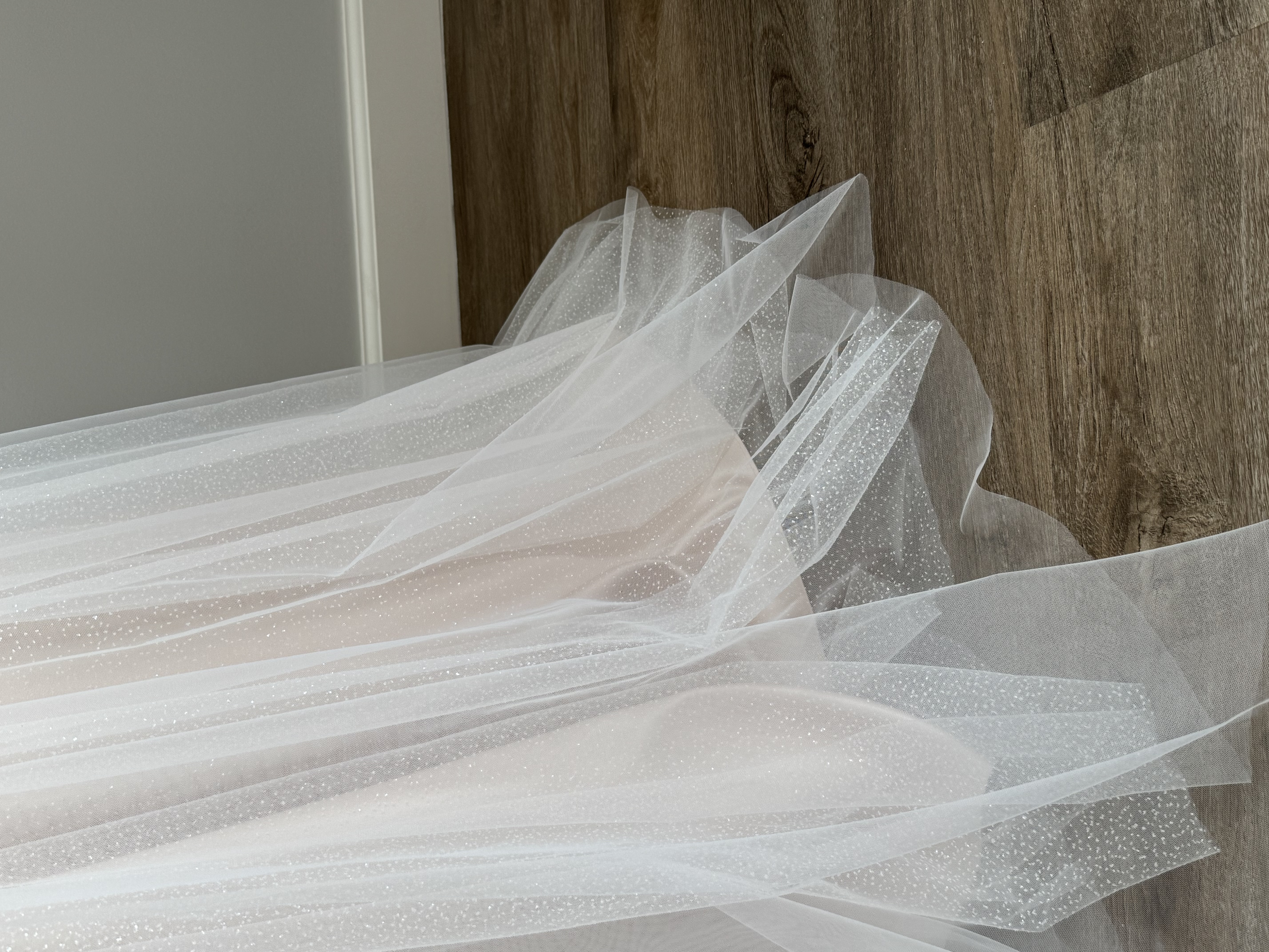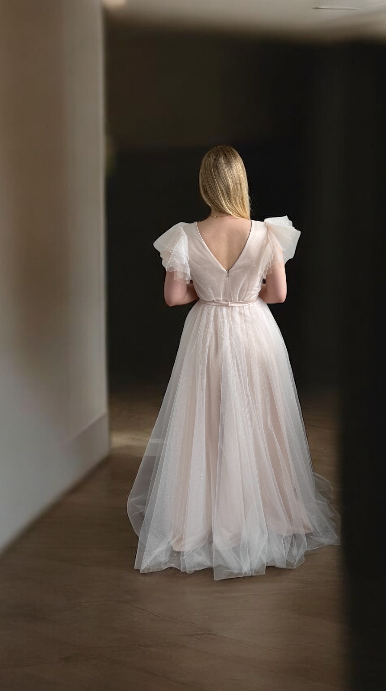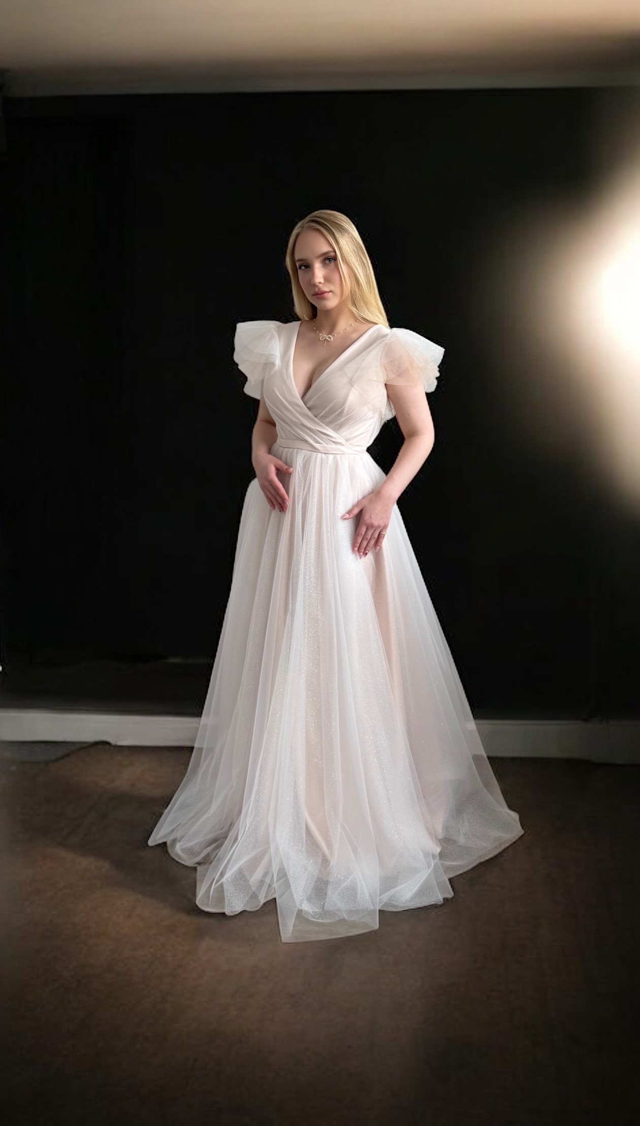 Это великолепное платье подчеркнет вашу женственность и особый статус. Вырез на груди создает утонченную линию декольте, а открытая спина добавляет образу загадочности. Полупрозрачные крылышки из мерцающей органзы на плечах придают легкость и волшебное сияние, создавая эффект сказочного образа. Верх выполнен из воздушной органзы с нежным блеском, а пышная юбка благодаря плотному подъюбнику сохраняет форму и добавляет драматичности. Идеально подходит для свадебных банкетов, романтических вечеров, выпускных или торжественных мероприятий.