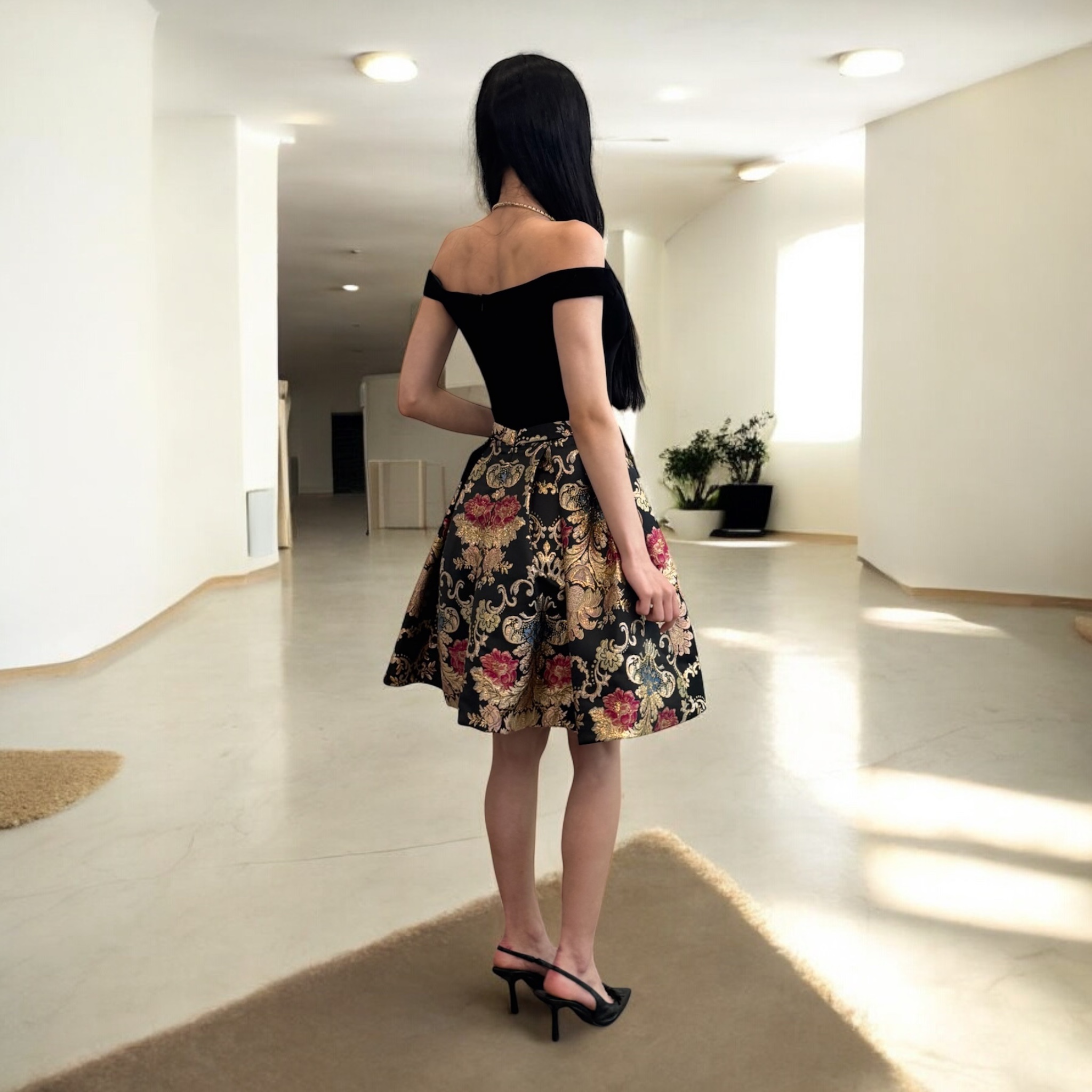 Это изысканное платье наполнено нежностью и утонченностью. Бархат придает образу богатство и глубину, а спущенные плечи создают чувственный и женственный силуэт. Романтичные цветочные мотивы добавляют образу легкости и романтики, делая его идеальным для особых случаев.