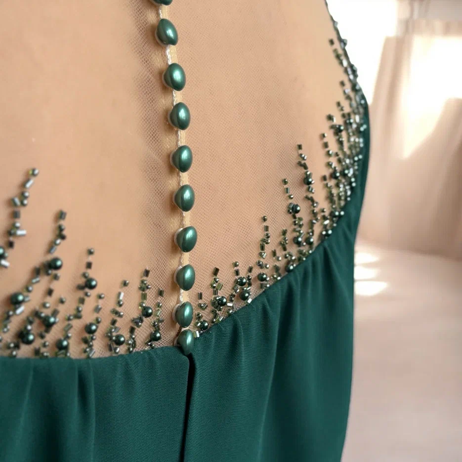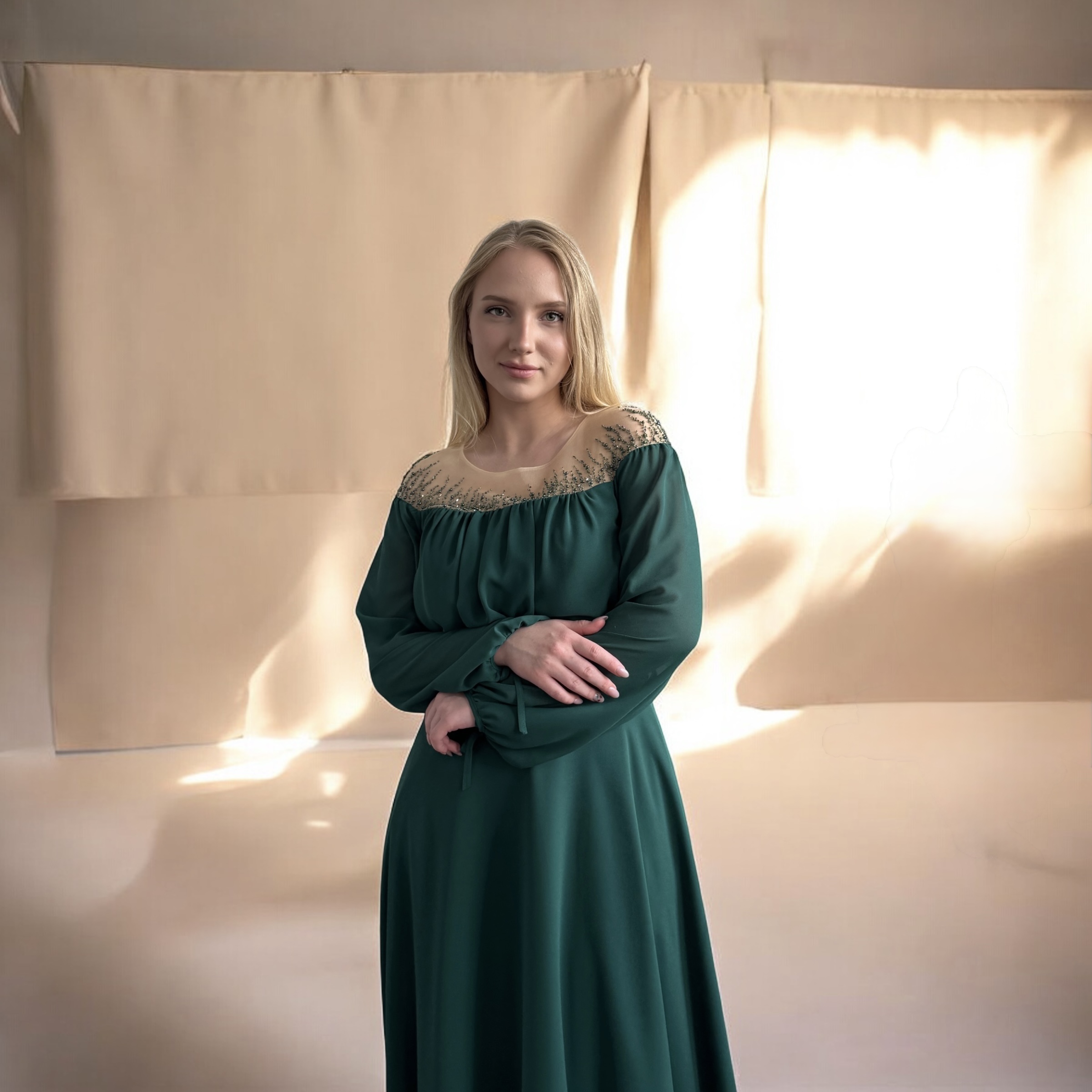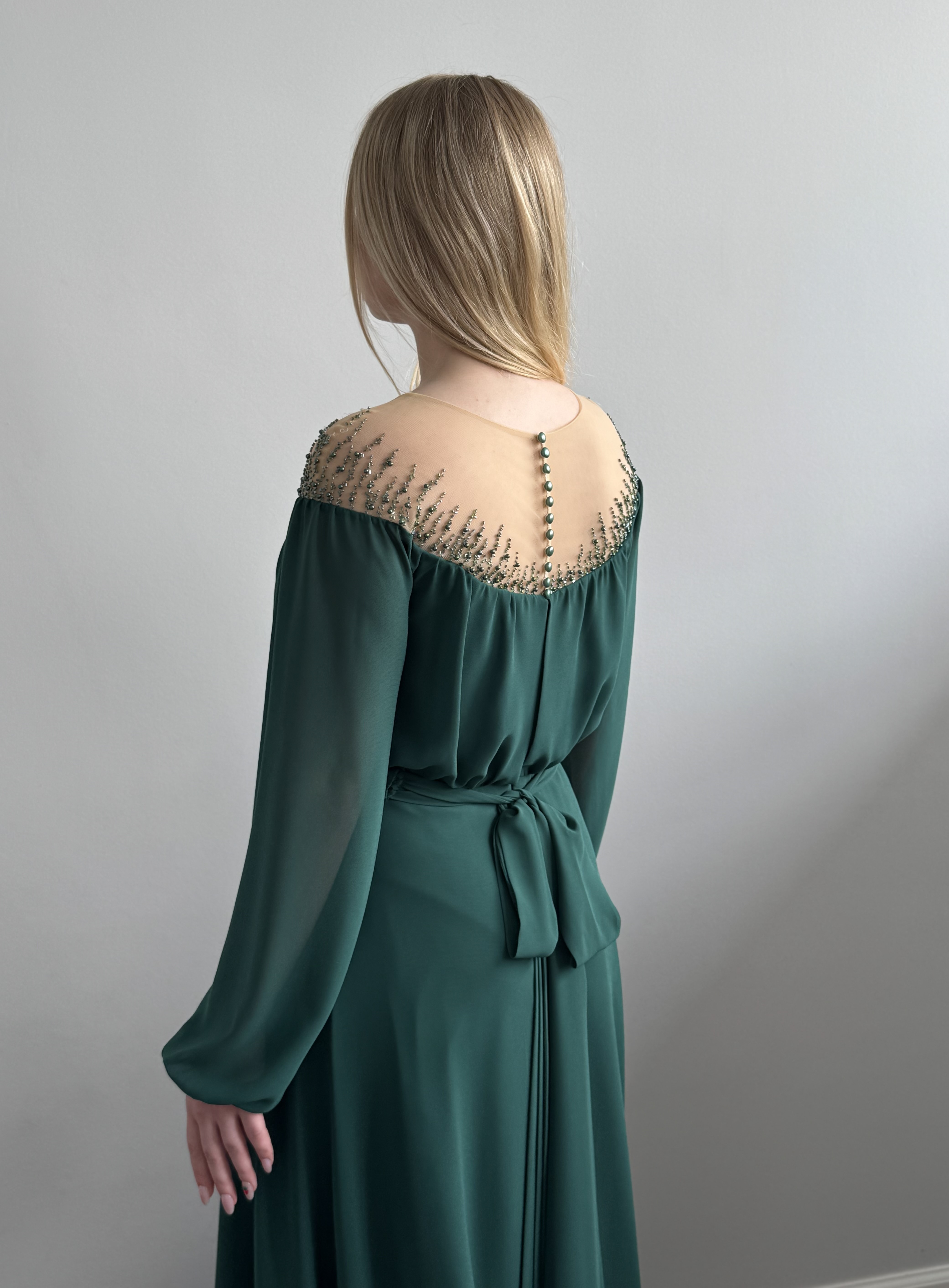 Это платье — воплощение элегантности и магии. Полупрозрачная сетка на плечах, груди и спине, расшитая изумрудным бисером, играет на свету, словно драгоценные камни, создавая эффект роскошного сияния. Универсальный пояс позволяет создавать образ по настроению: нежный бант или строгий узел — подчеркните свою индивидуальность.