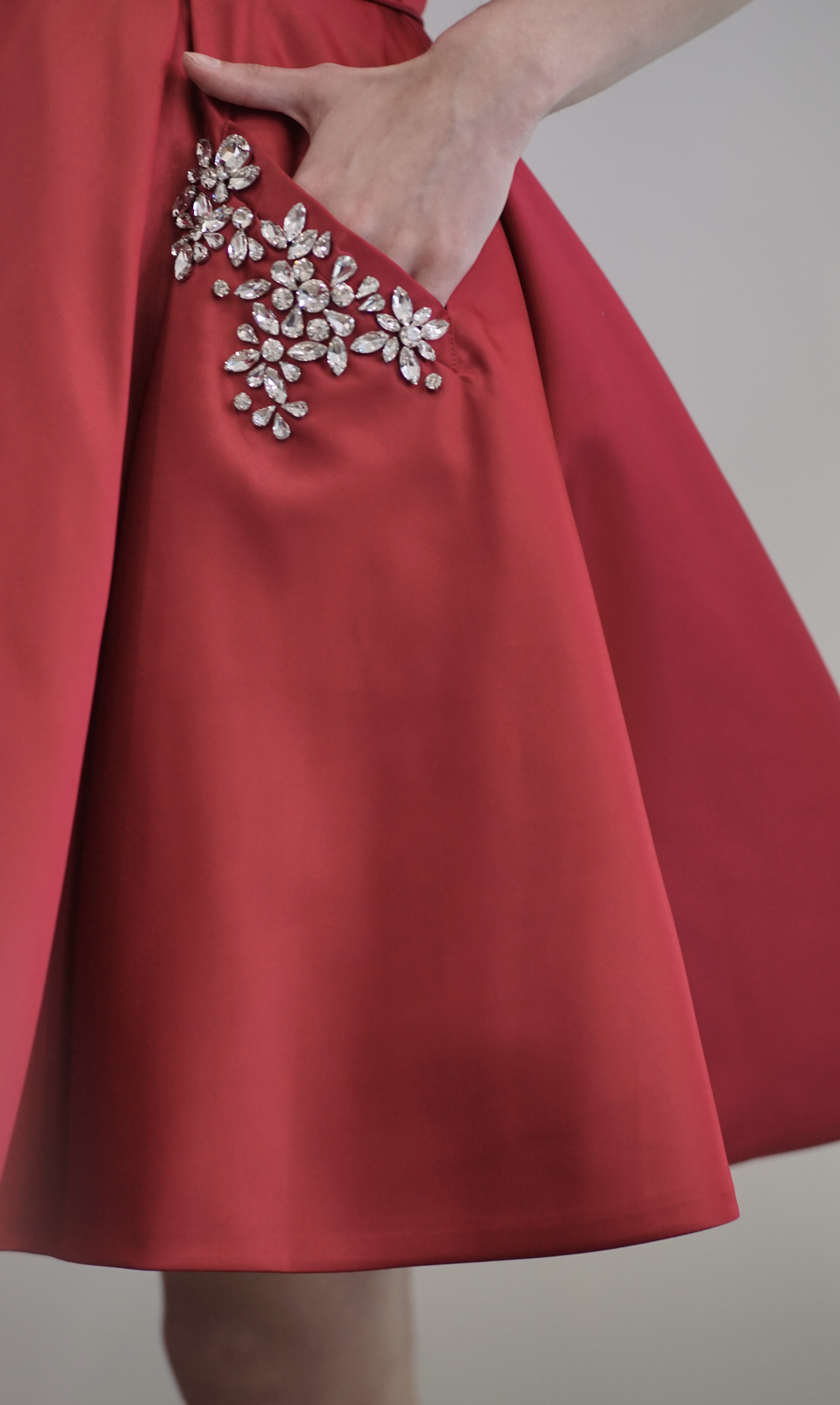 Это платье воплощает роскошь в каждом движении. Яркий малиновый оттенок привлекает взгляды, а соблазнительный корсетный верх идеально садится по фигуре, создавая эффект женственной грации. Пышная юбка добавляет образу романтики и изящества. Неожиданным и практичным элементом являются глубокие карманы, отделанные камнями — стильное решение для удобства. Благодаря корсетному основанию достигается идеальная посадка, подчеркивающая достоинства фигуры.