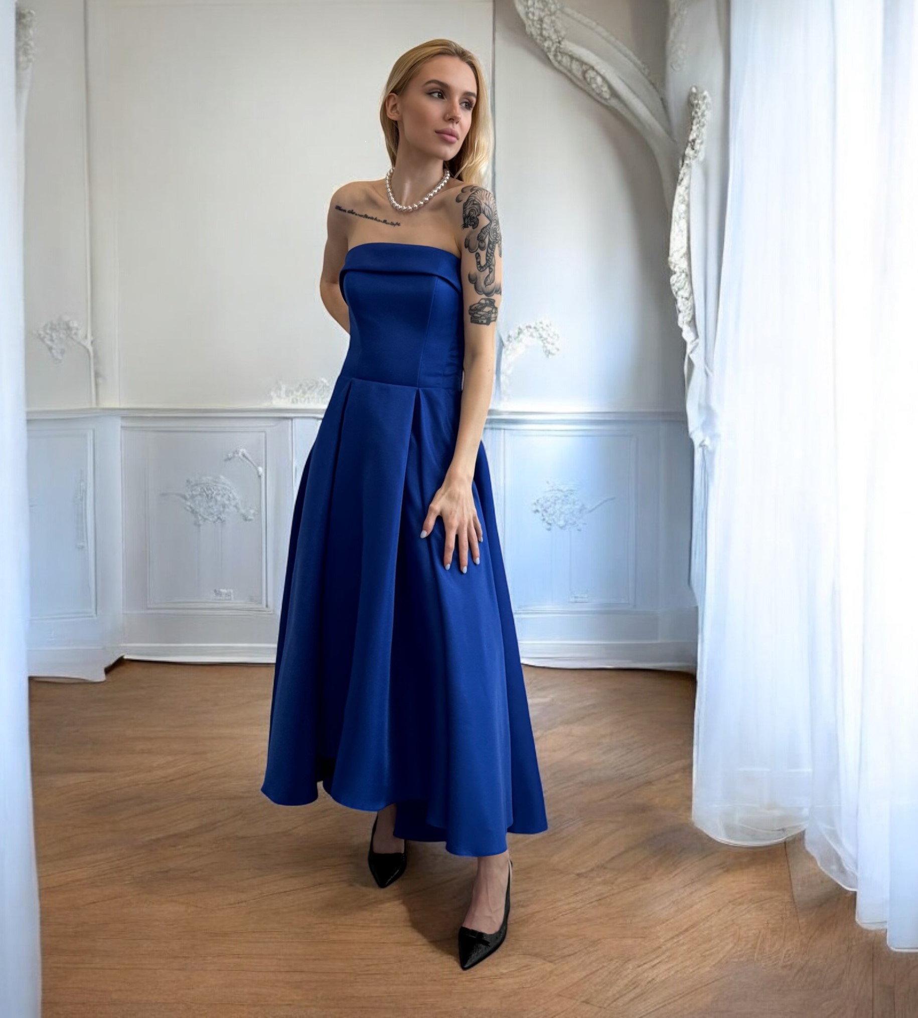 Это изысканное платье подчеркнет вашу женственность и элегантность. Открытые плечи создают нежный и соблазнительный образ, а шнуровка на спине добавляет нотки пикантности и позволяет регулировать посадку для идеальной посадки. Игра длин — укороченный перед и удлиненная спина — создает динамичный, летящий силуэт, придавая образу особую легкость и изящество.