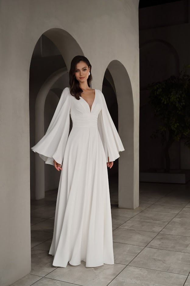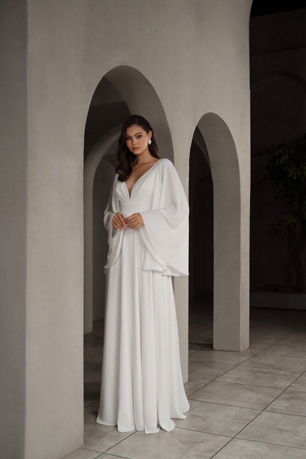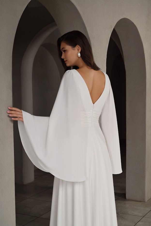 Платье выполнено в классическом белом оттенке с роскошным расклешенным рукавом, который создает эффект воздушности и грации. Длинный подол добавляет образу нежности и царственности. V-образный вырез на спине - элегантная открытость , идеально для свадебных фото.